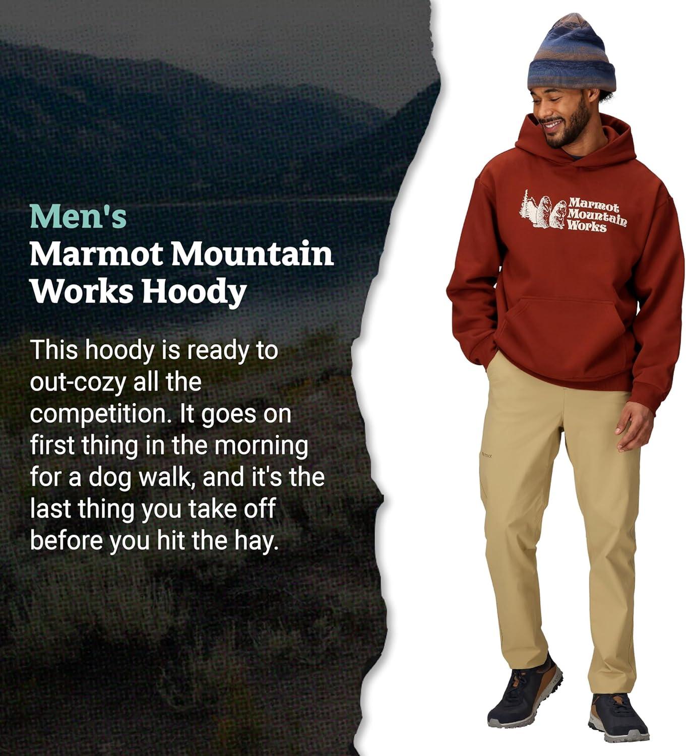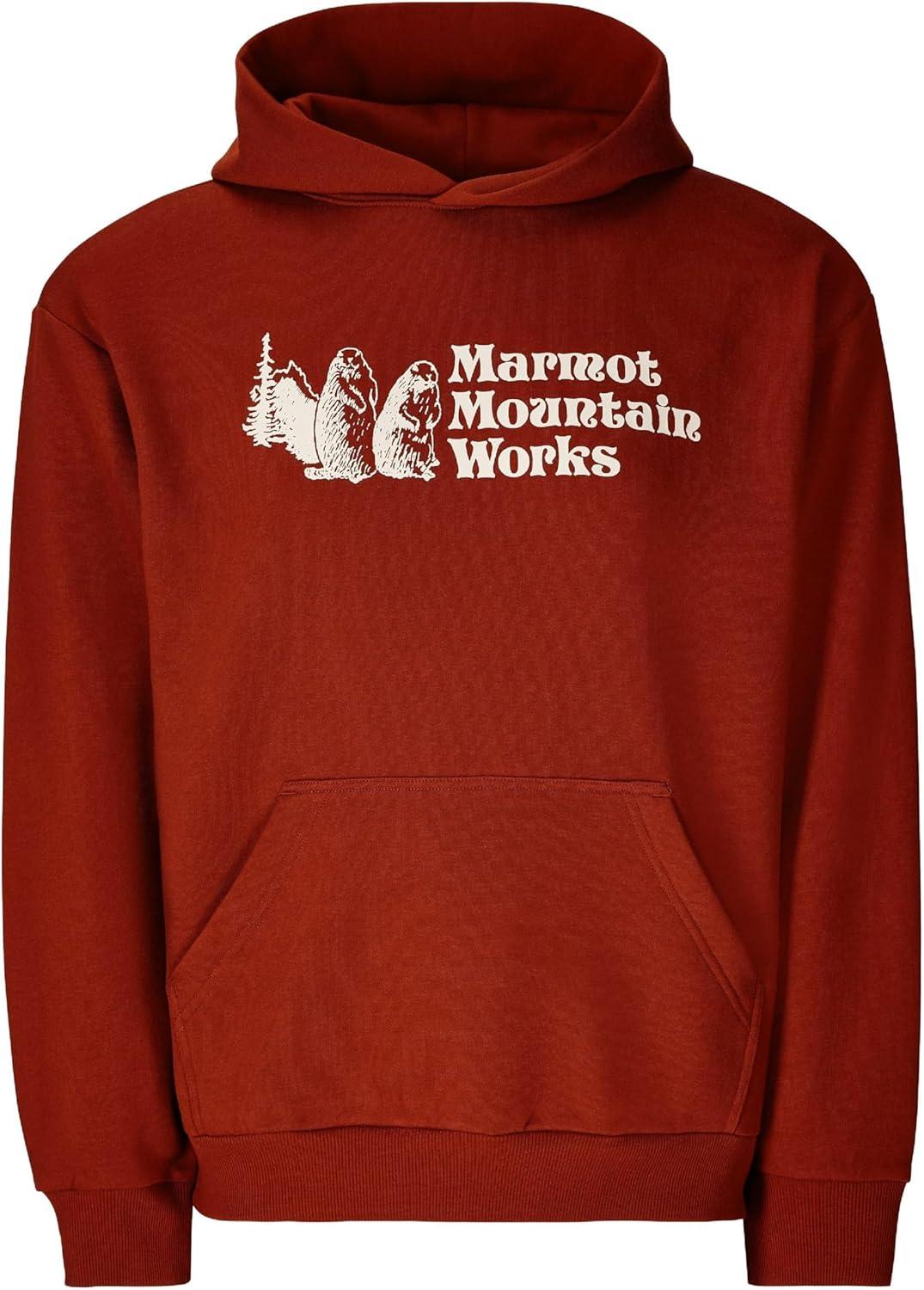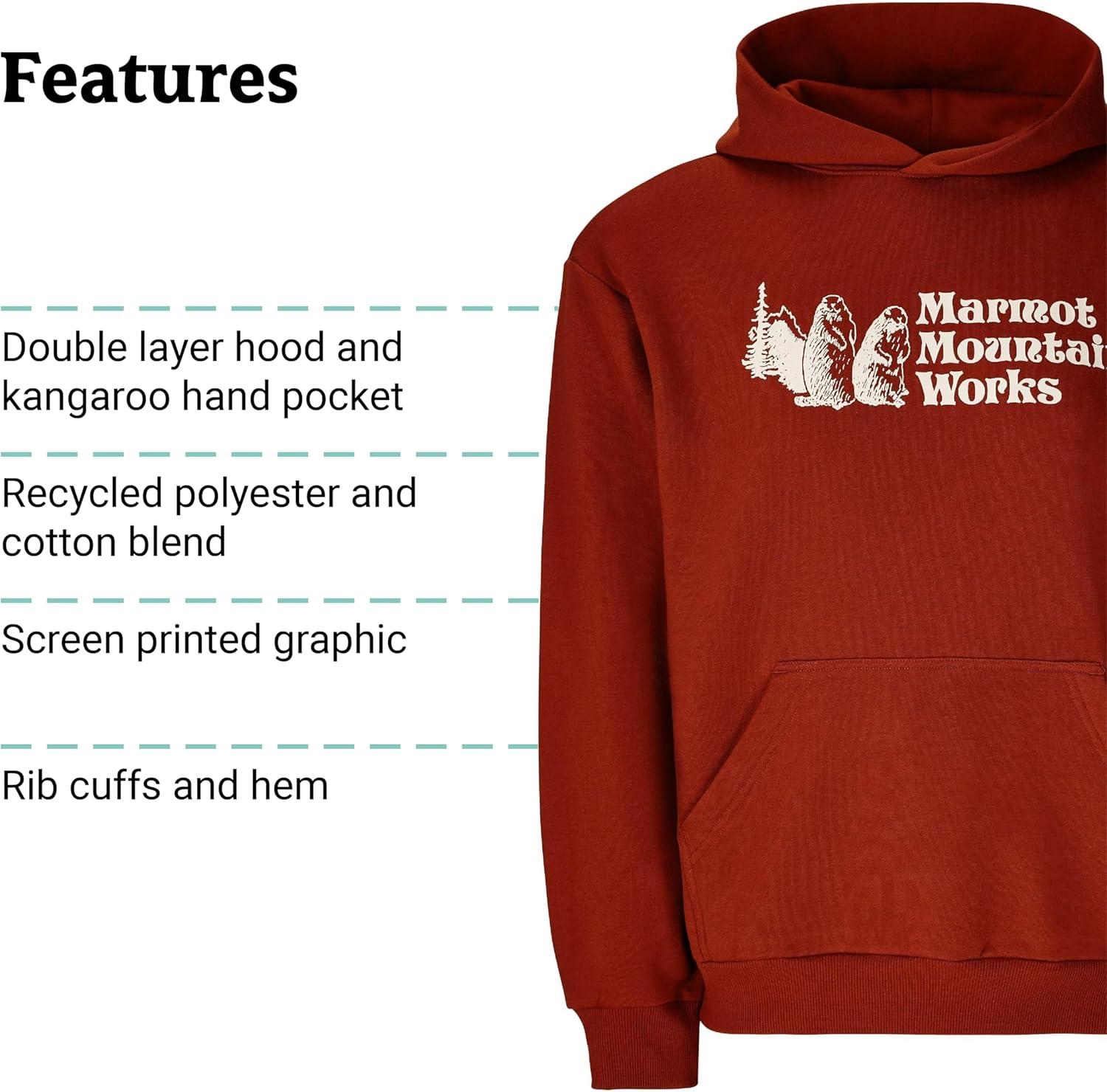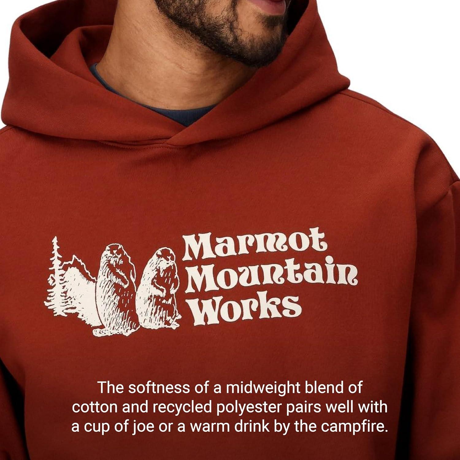 This midweight blend of cotton and recycled polyester embodies your outdoor lifestyle, with a softness that's ideal for pre/post activity or hanging by camp, and featuring a heritage Marmot mountain works logo.