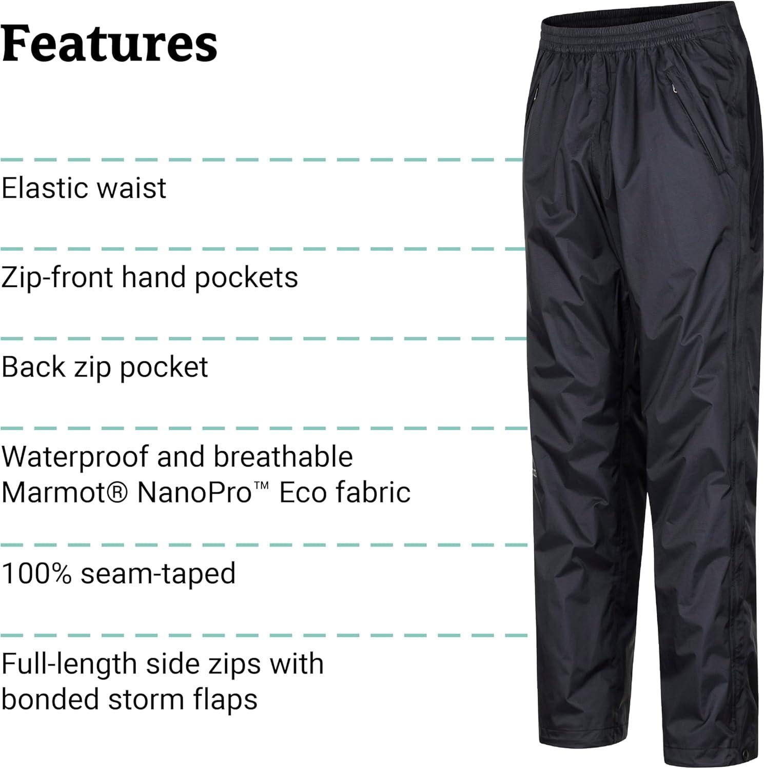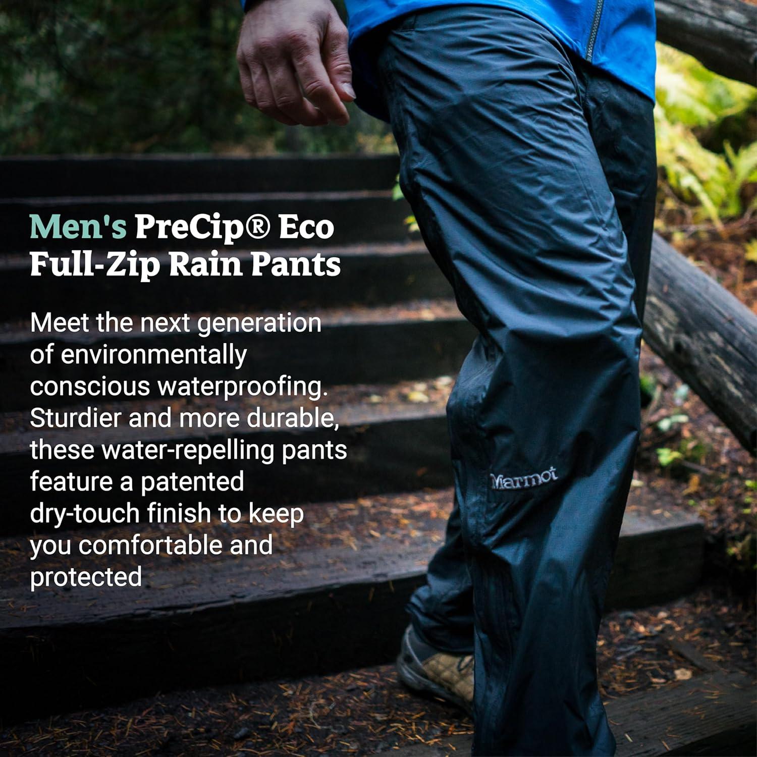 Meet the environmentally conscious and high-performing next generation of waterproofing: the lightweight PreCip Eco Full Zip Pant. The waterproof/breathable, PFC-free Marmot NanoPro™ recycled nylon face fabric lasts longer, thanks to the advanced technology of our microporous coating. Sturdier and more durable and with a patented dry-touch finish, these water-repelling pants will keep you comfortable and protected during planned treks in stormy weather and as a just-in-case piece in your pack for unexpected downpours. These water-repelling pants also feature fully taped seams to prevent leaks, full-length side zippers to allow quick and easy layering, and bonded storm flaps over the zippers to keep moisture out. Zippered hand pockets and a zippered back pocket provide quick storage while the elastic waist gives you a secure yet comfortable fit.