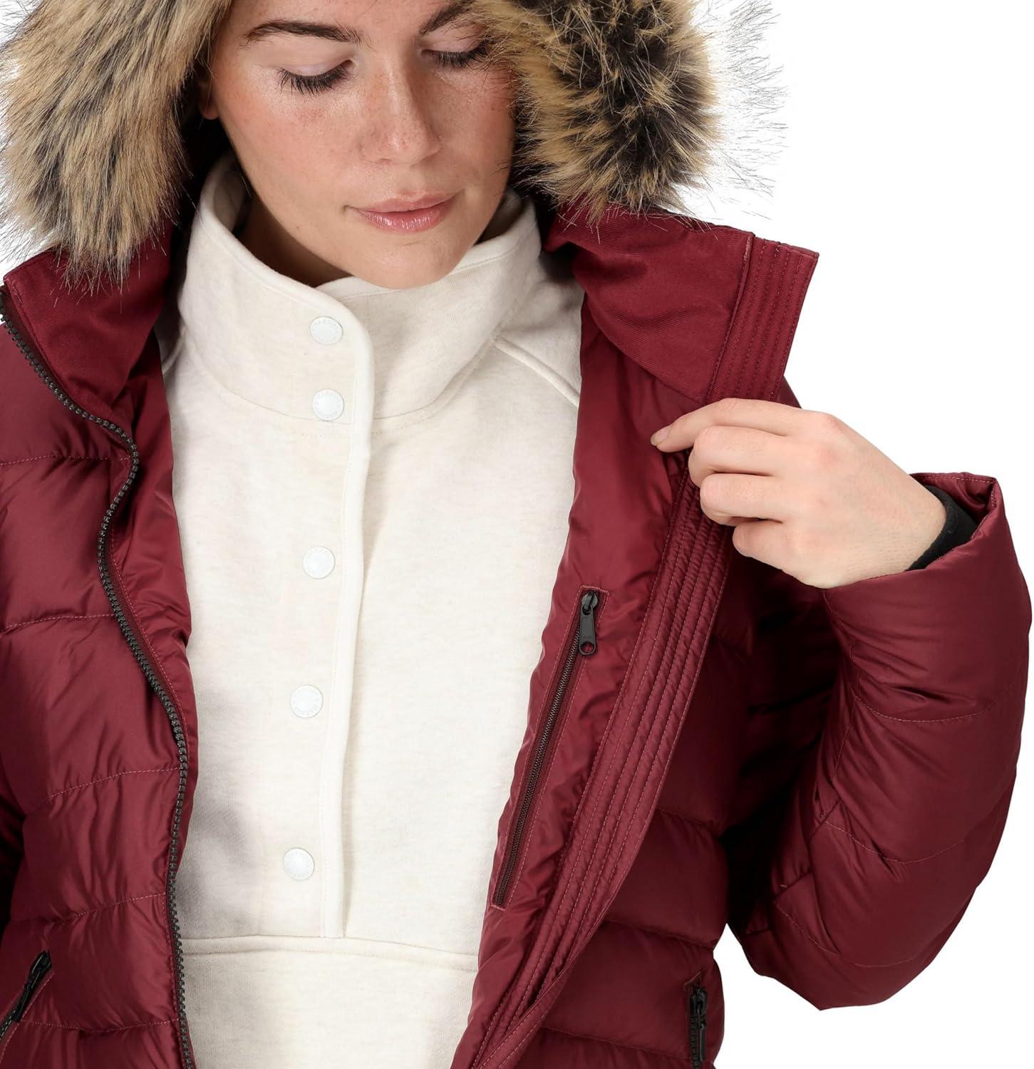 This short winter down coat has chevron baffles and removable faux fur on the hood for a modern look, and Down Defender for improved insulation performance.
