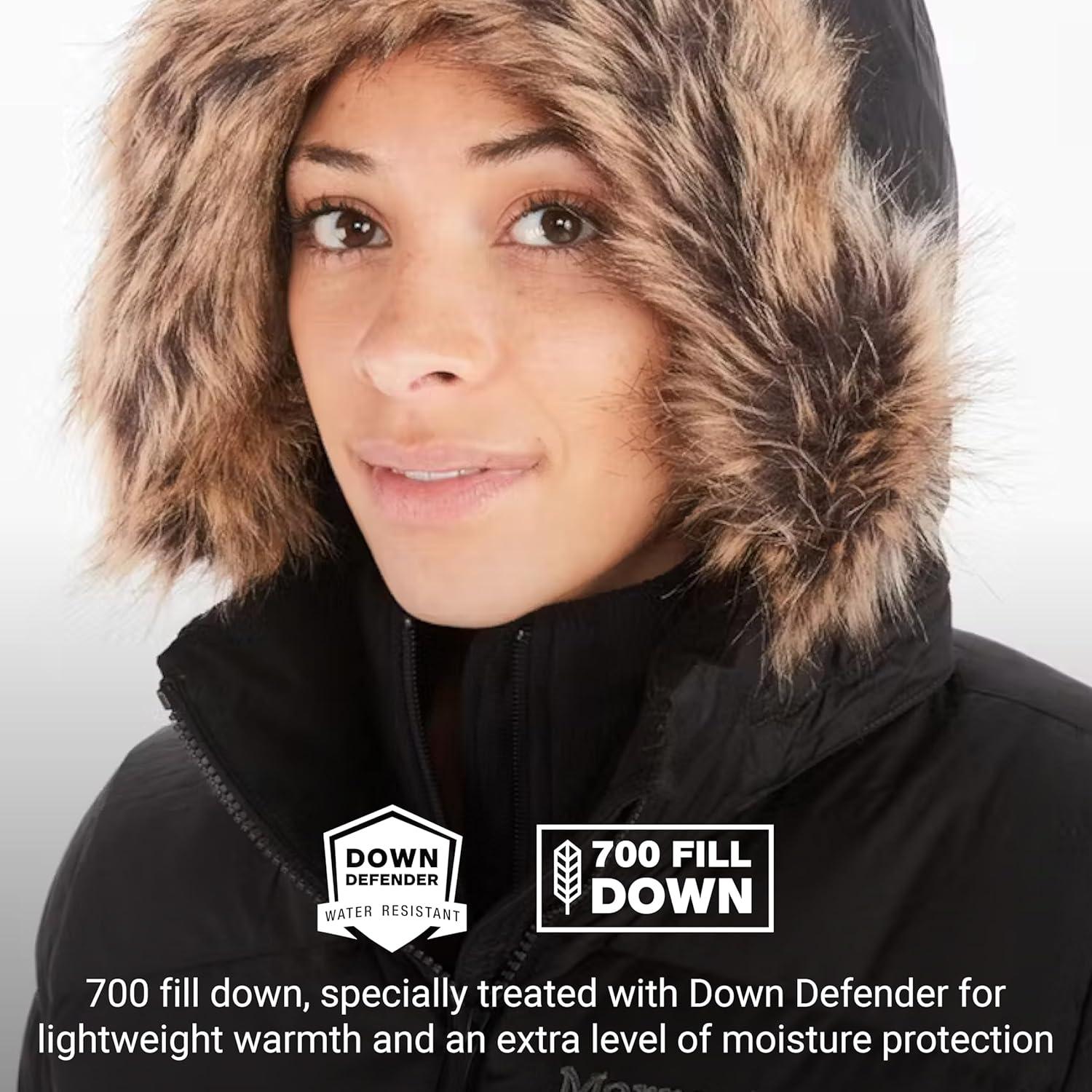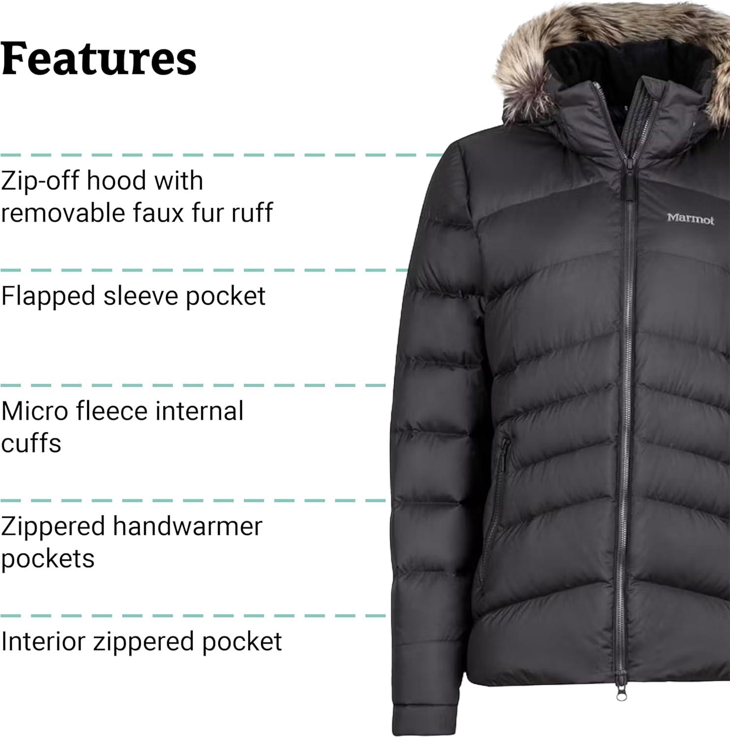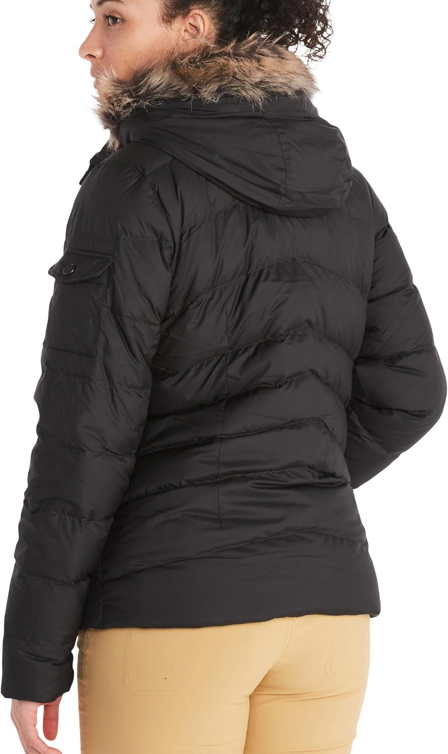 This short winter down coat has chevron baffles and removable faux fur on the hood for a modern look, and Down Defender for improved insulation performance.