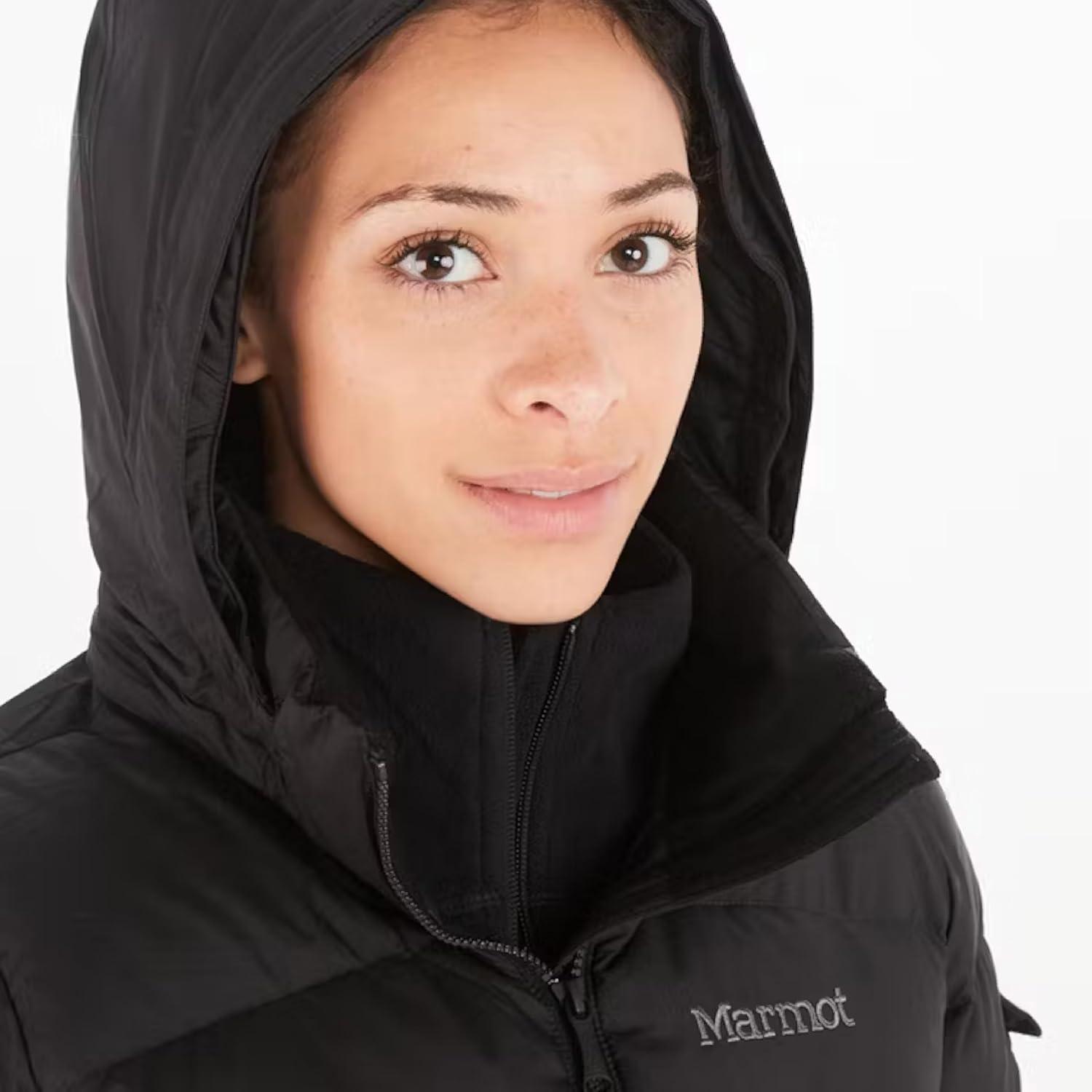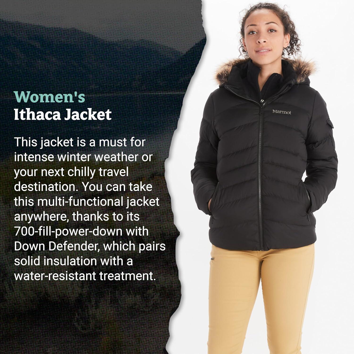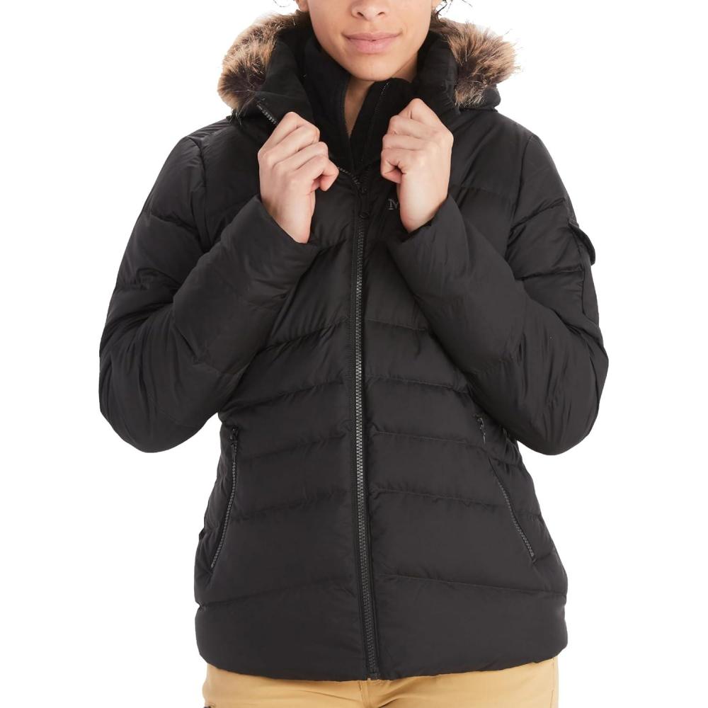 This short winter down coat has chevron baffles and removable faux fur on the hood for a modern look, and Down Defender for improved insulation performance.